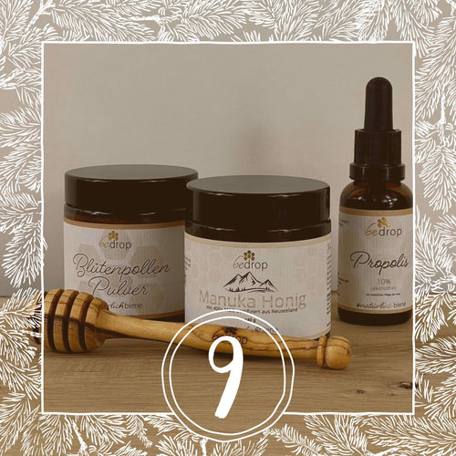Detrás de la puerta número 9 se encuentran dos maravillosos conjuntos que te harán sentir bien durante el invierno.BeddropCon miel de Manuka, polen de flor en polvo, gotas de propóleo y una cucharita de miel. ¡Mucha suerte! 🍀