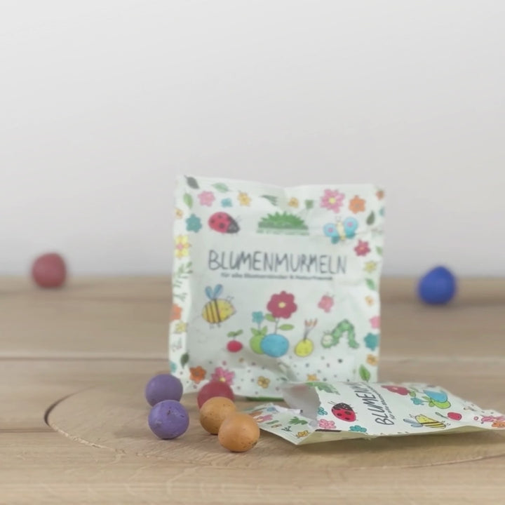 Las 5 canicas de flores de colores en la bolsa sellada diseñada con cariño crean un colorido prado de flores dondequiera que caen.