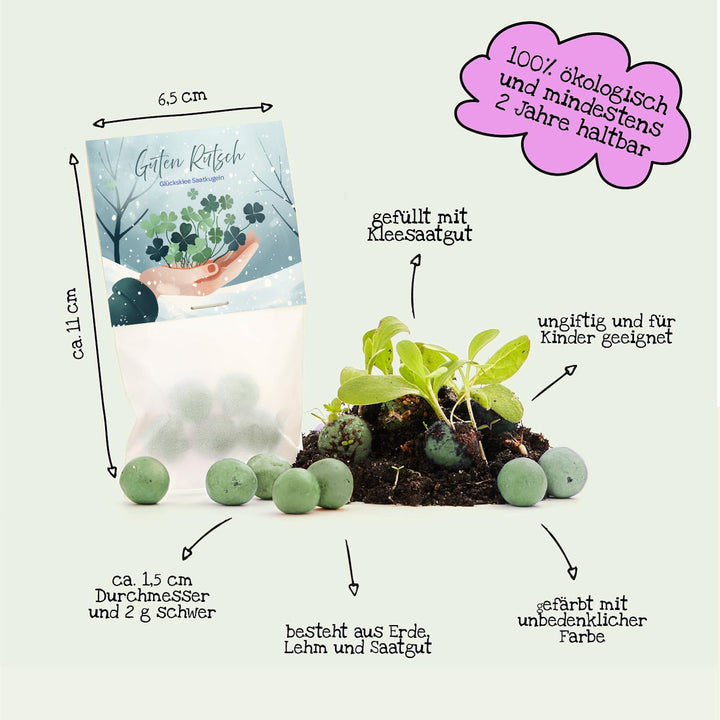 🍀 PORCIÓN EXTRA DE FELICIDAD:Con nuestras bombas de semillas, apoyas a la naturaleza y alegras a las abejas. Simplemente tíralas en primavera: las semillas de trébol traerán una dosis extra de suerte en el nuevo año y revitalizarán tu jardín.