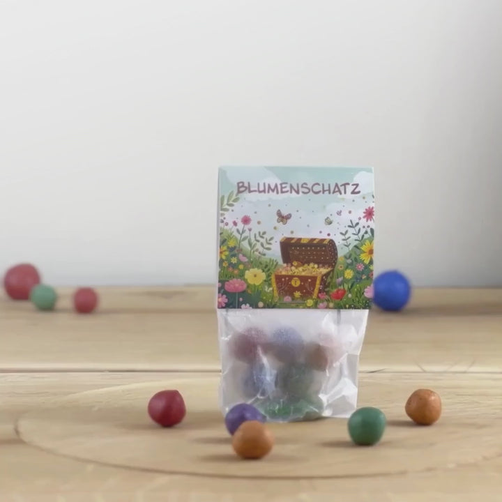 Recuerdo de fiesta ideal para el cumpleaños de un niño o como regalo de despedida para la guardería: contiene 10 bolsas diseñadas con cariño, cada una con 5 canicas de flores de colores, de las que crece un prado de flores: una gran idea de regalo para los invitados a la fiesta joven o para el jardín de infancia (Una canica de flores tiene un diámetro medio de 1,5 cm (+/-).)