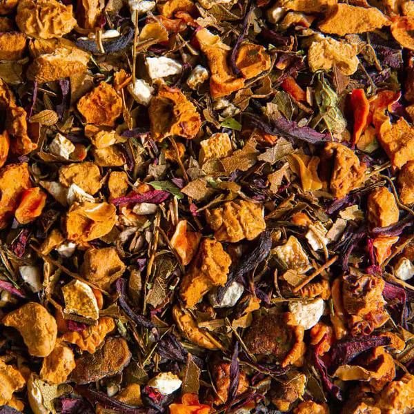 Ingredientes:Manzana orgánica, hojas dulces de mora orgánica, hibisco orgánico, 8% de cáscara de naranja orgánica, 7% de zanahoria orgánica, mirto limón orgánico, hierba dulce orgánica, aceite de naranja orgánico, aceite de mandarina
