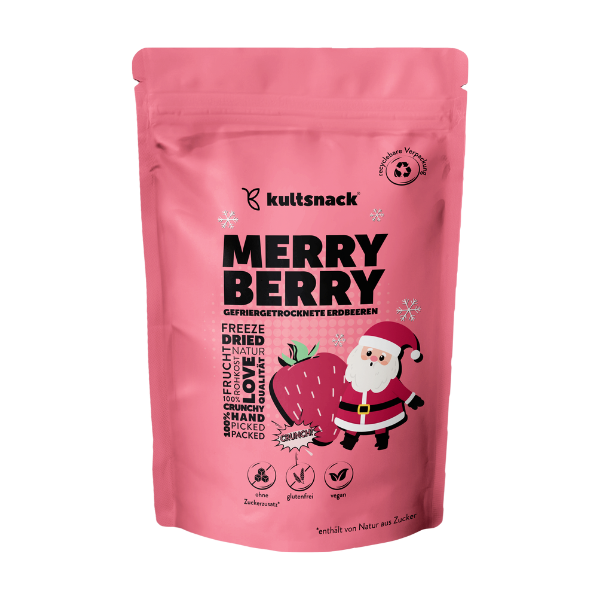 Con las fresas liofilizadas “Merry Berry” el recuerdo del verano llega al invierno.180 g de fresas frescasfueron liofilizados cuidadosamente para este paquete. El resultado: unaperitivo aromático, agridulceque sabe a fresas frescas, sólo que crujientes y ligeras como las patatas fritas.