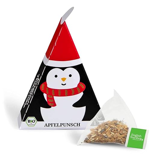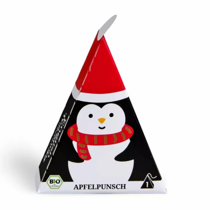 El pequeño envase piramidal con diseño de pingüino contiene una equilibrada mezcla de especias orgánicas: gajos de naranja, canela, anís, clavo y cardamomo. Simplemente añádelo a zumo de manzana caliente y déjalo reposar durante 10 minutos; se convertirá en un reconfortante ponche de manzana.
