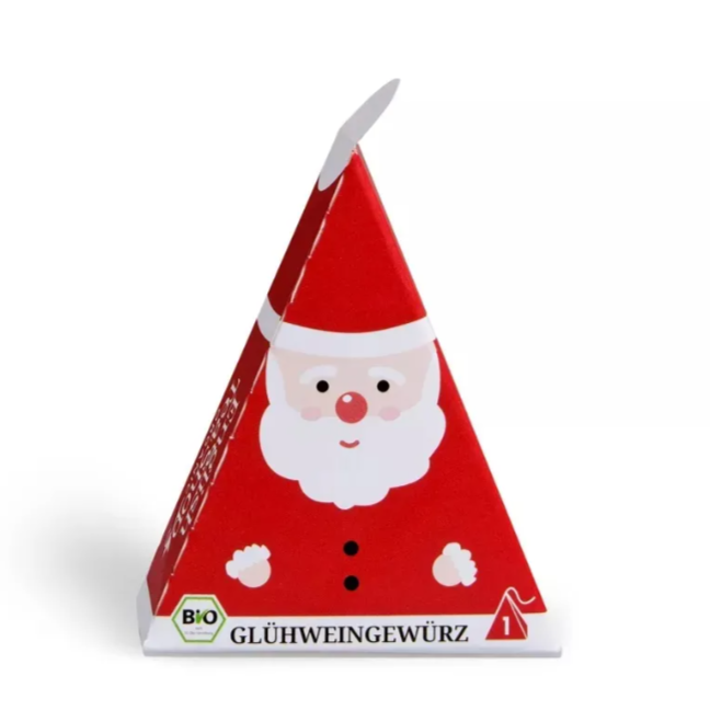 El pequeño recipiente piramidal con motivo de Papá Noel contiene una exquisita mezcla de especias orgánicas: canela, clavo, cardamomo, cáscara de naranja y limón. Simplemente infusione con vino tinto o blanco caliente para darle a su bebida un agradable sabor invernal.