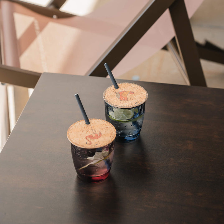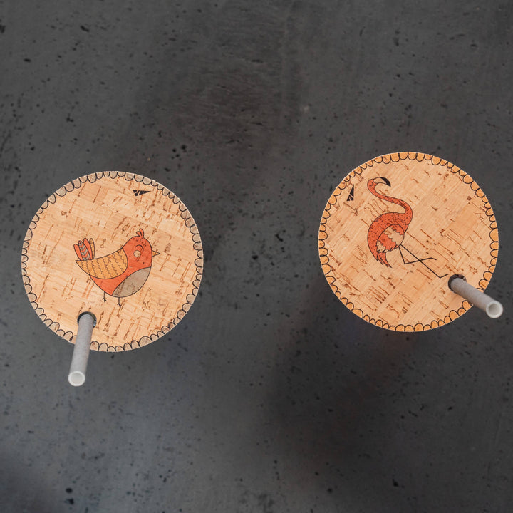 La tapa, con un cariñoso estampado de un pájaro cantor, está hecha de corcho de alta calidad con un grosor de 3 mm. Tiene un diámetro de 9 cm y un orificio para la pajita de 9 mm.