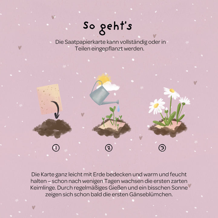 Sostenible y libre de plásticoLa tarjeta está hecha de papel de semillas compostable, el sobre está hecho de papel kraft reciclado y la funda protectora es biodegradable: un saludo ecológico que toca corazones y protege el medio ambiente.