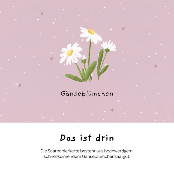 Margaritas como muestra de agradecimientoDelicadas margaritas pronto brotarán del papel con semillas: un saludo viviente que subraya el significado de tus palabras. Una pequeña flor con un gran mensaje: Gracias por estar ahí cuando era necesario.