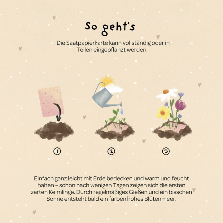 🌷 Simplemente planta:La tarjeta se puede plantar entera o en pedazos. Con un poco de tierra, agua y sol, surgirá un colorido mar de flores: un cariñoso recuerdo de un cumpleaños especial.