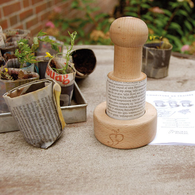 Una herramienta práctica y bonita, hecha de madera de haya de alta calidad, para hacer macetas de papel de periódico. No solo es divertida, sino también ecológica. En lugar de usar macetas convencionales de arcilla o plástico, puedes crear tus propias macetas de papel con la prensa.