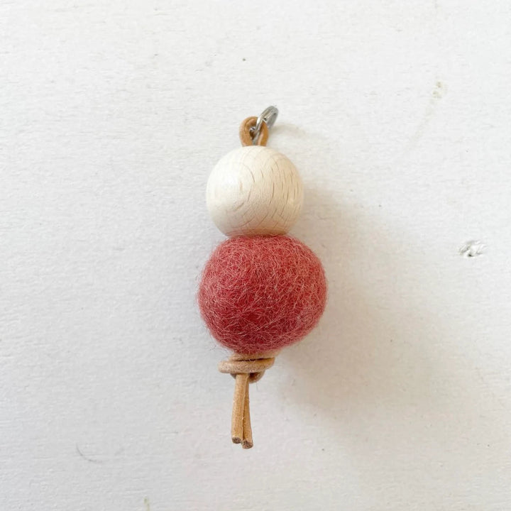 Conjunto de llaveros hechos a mano con bolas de fieltro de lana y cuentas de madera sobre fondo blanco.