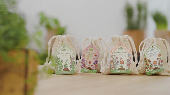 Sostenible y sencillo:La bolsa está hecha de algodón sostenible con certificación GOTS y es reutilizable. Las bolas de semillas son fáciles de extraer; no se requiere experiencia en jardinería.