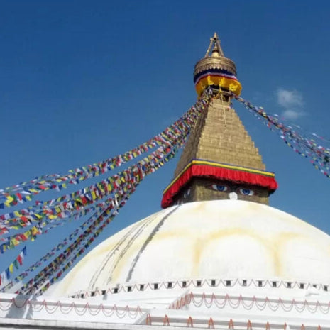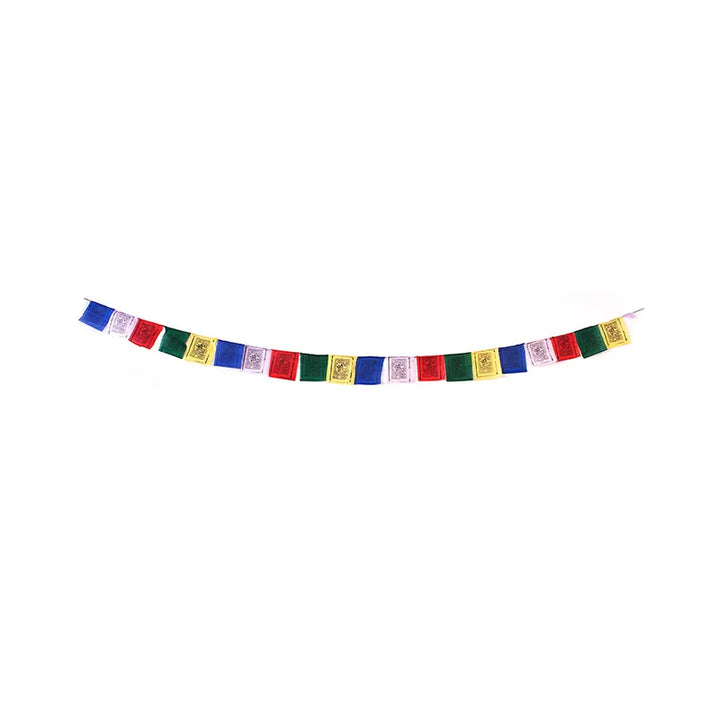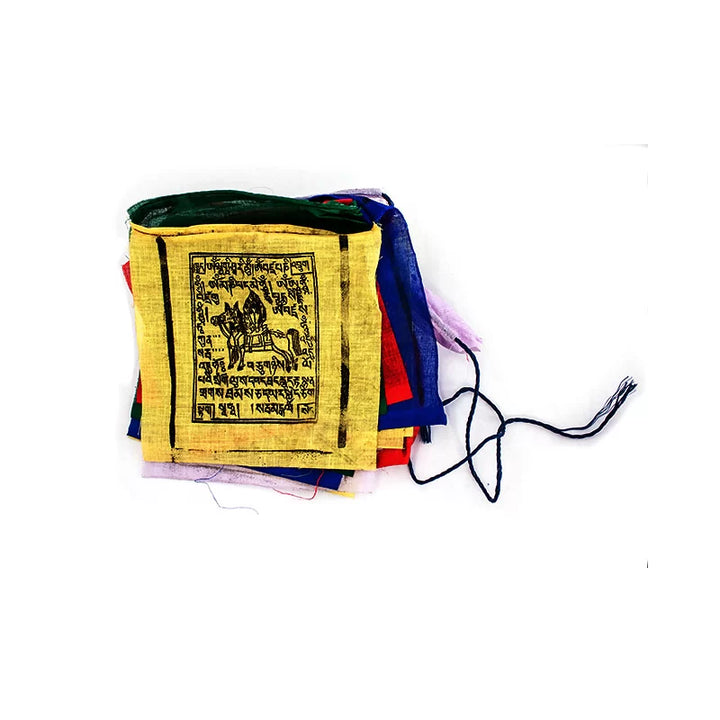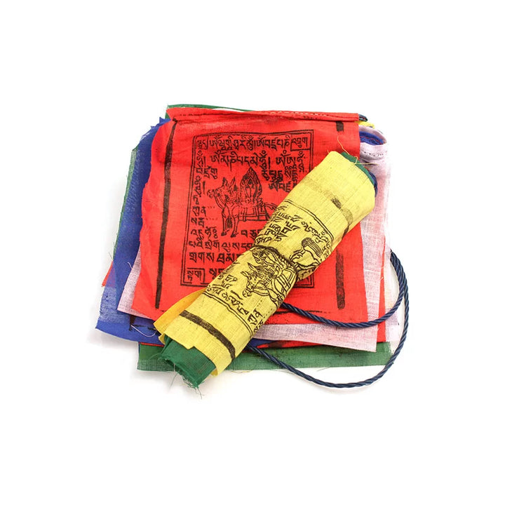 Cada bandera está hecha con cariño.Hecho a mano en Katmandú (Nepal)Cerca de la gran estupa. Allí, un exiliado tibetano y su pequeño equipo producen estas banderas de oración con métodos tradicionales, sin usar poliéster ni procesos de impresión sintéticos. Esto no solo promueve una artesanía ancestral, sino que también protege el medio ambiente: al deshilacharse naturalmente, las banderas llevan las oraciones y mantras impresos por todo el mundo sin dejar rastros de plástico.