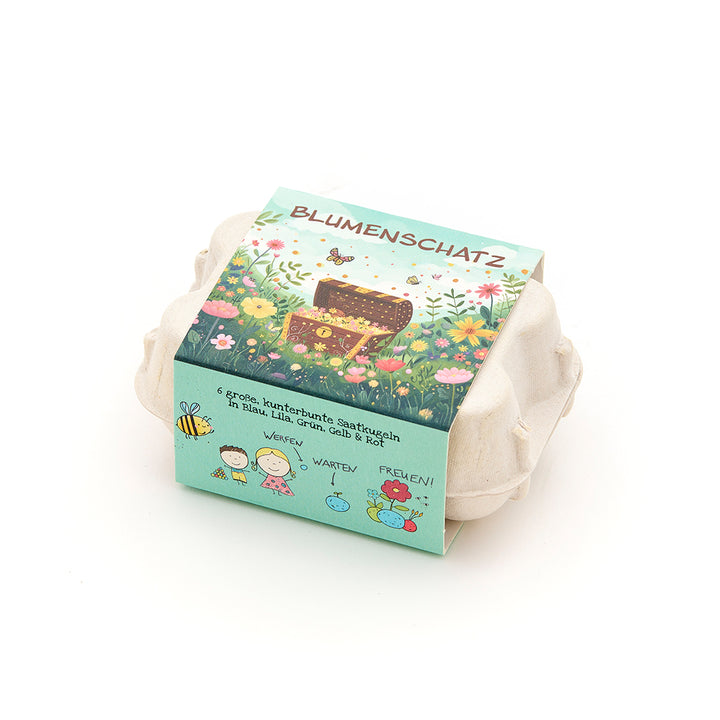 Zauberhafter Blumenschatz für Kinder: Die 6 bunten Blumenmurmeln im Mini-Eierkarton sind ein liebevoll gestaltetes Geschenk für Kinder – ideal als Mitgebsel für Geburtstage, Schatzsuchen oder Gartenpartys. Das zarte „Blumenschatz“-Design sorgt für strahlende Augen bei kleinen Gästen.