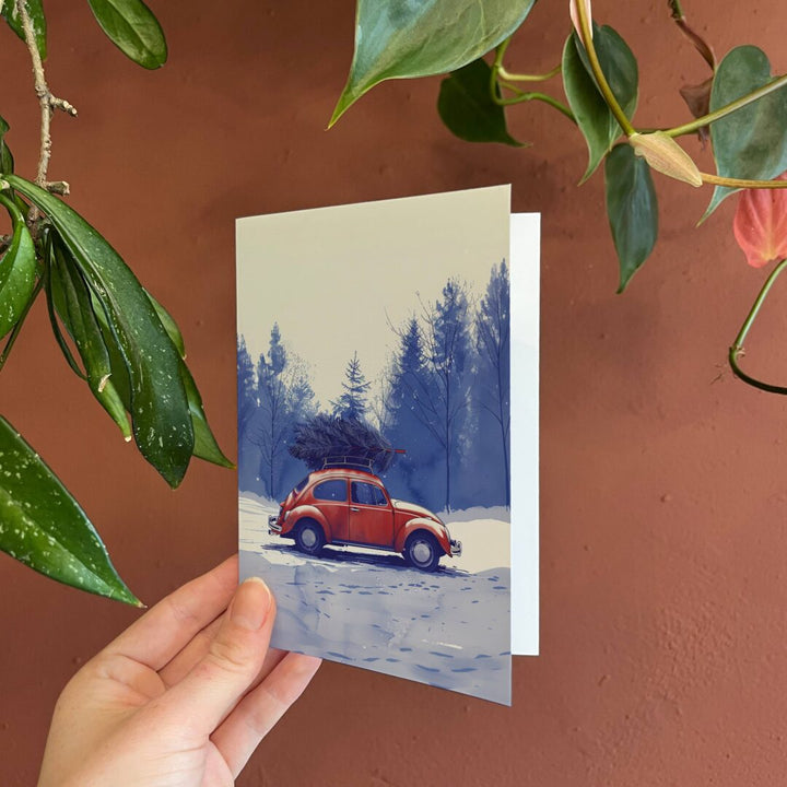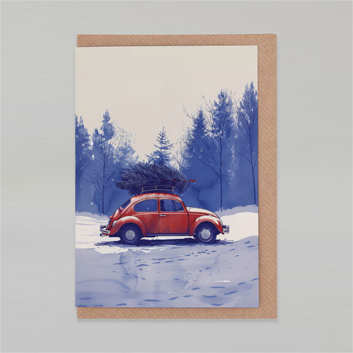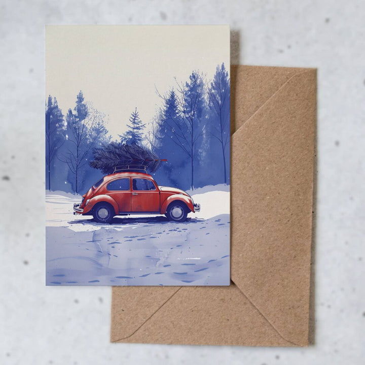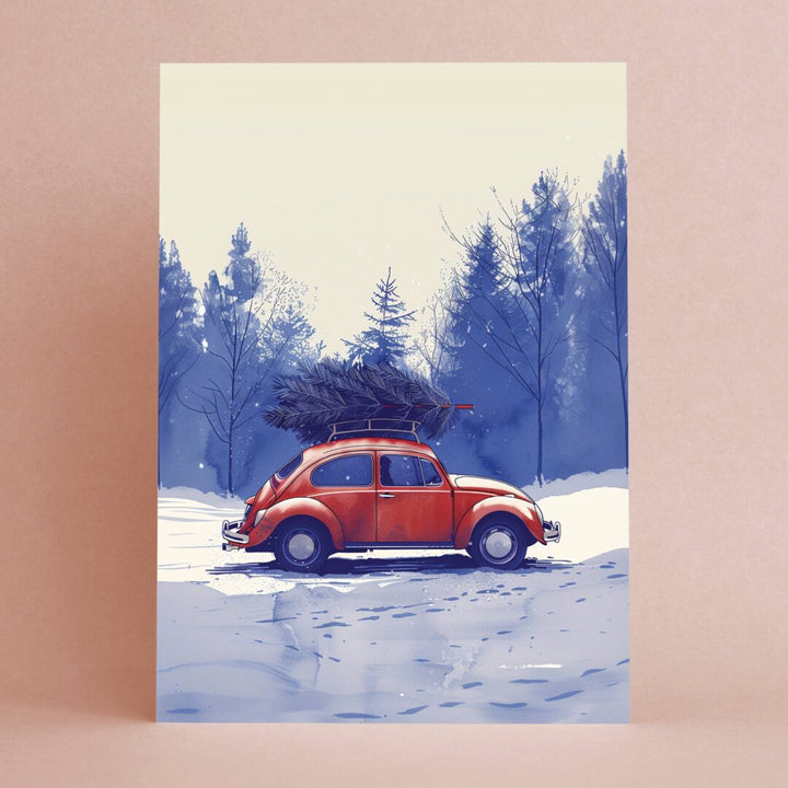 Esta encantadora tarjeta navideña, titulada “Comprar un árbol”, presenta una hermosa ilustración de un clásico Citroën 2CV rojo que lleva un gran árbol de Navidad en su techo y conduce por la nieve.celebra el espíritu navideñocon un toque deEncanto vintage.