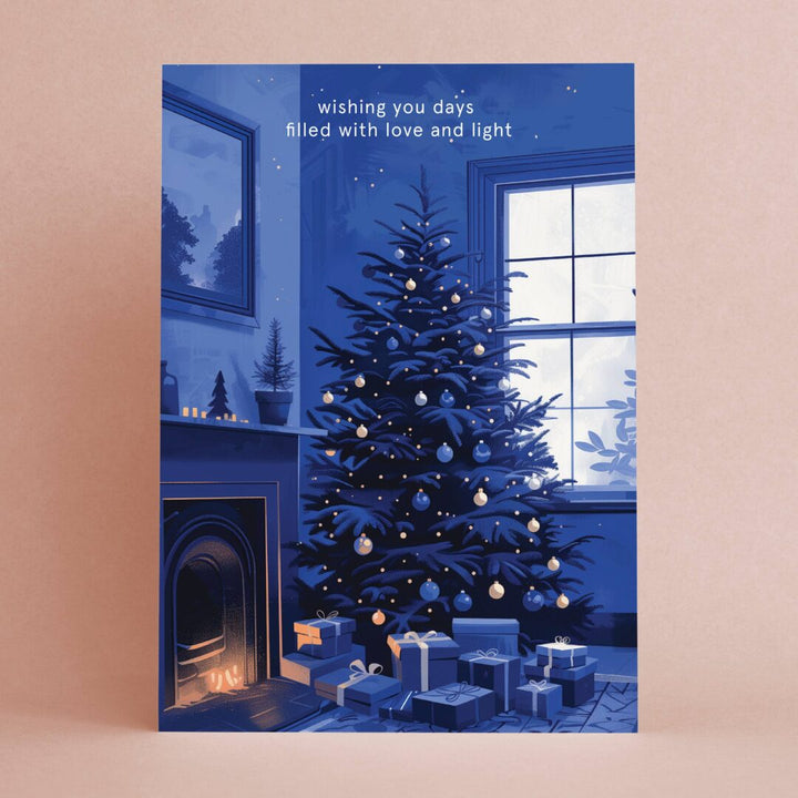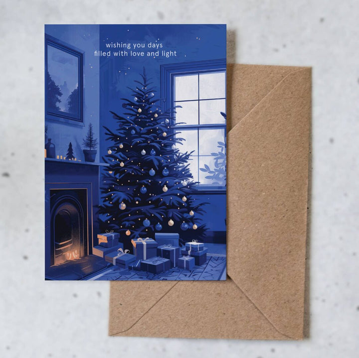 Este conmovedora tarjeta navideñacon el titulo“De vuelta a casa para las vacaciones”Presenta una hermosa ilustración de una acogedora sala de estar decorada con motivos navideños. La escena muestra una chimenea encendida, un gran árbol de Navidad adornado con adornos y una pila de regalos esperando a ser abiertos.