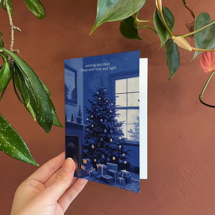 La tarjeta está impresa en offset en papel grueso mate con certificación FSC (350 g/m²). El interior es blanco y se entrega con un sobre de papel kraft reciclado (sin plástico, sin embalaje exterior). La tarjeta tiene formato A6 (14,85 x 10,5 cm).